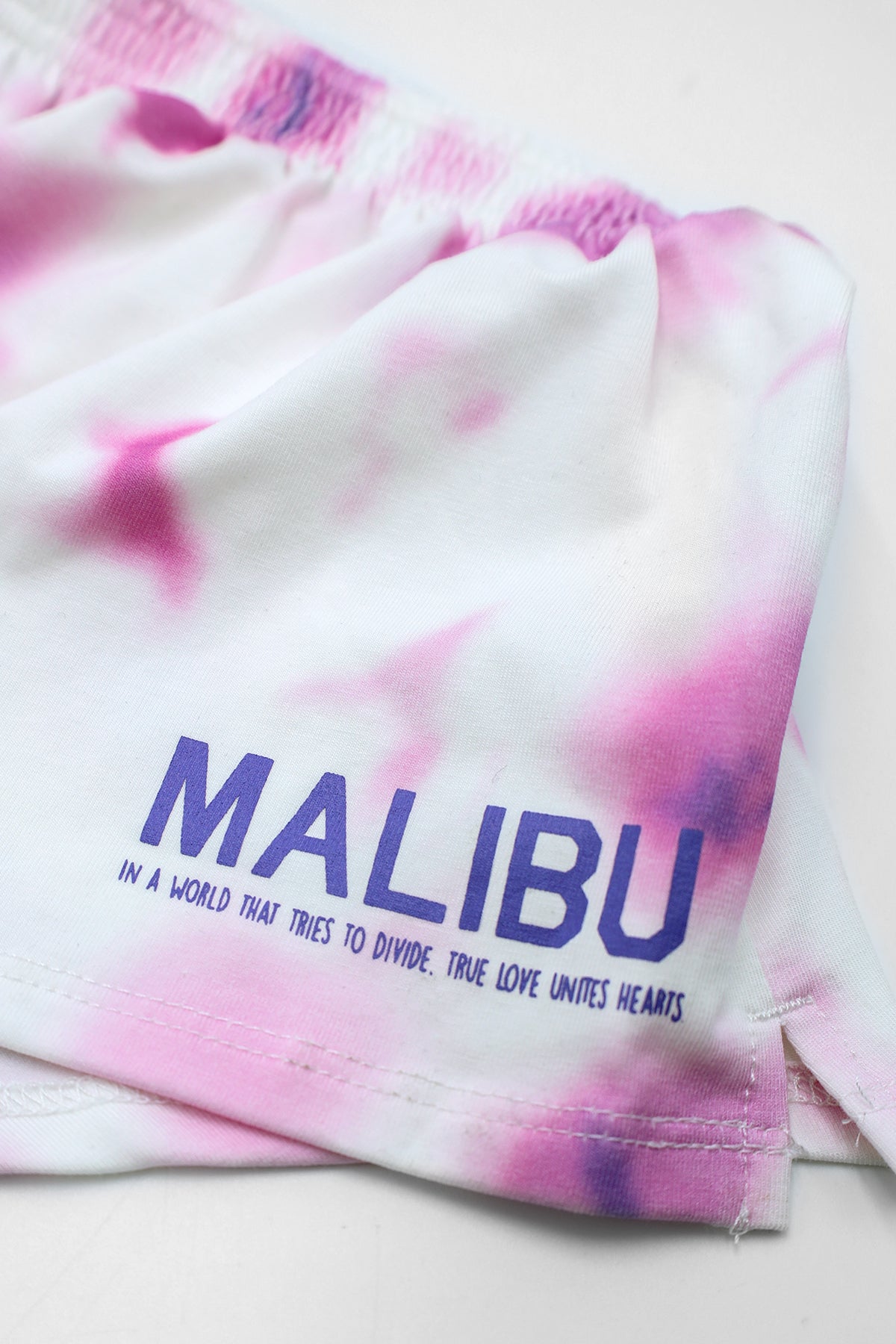 • Graphic print logo on left side: "Malibu: In a world that tries to divide. True love unites hearts."